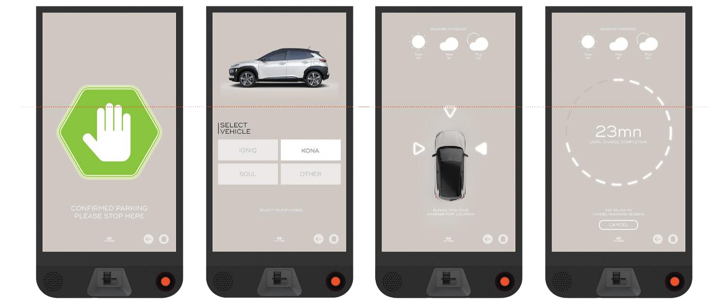 The user-friendly interface enables individuals to effortlessly select the position of their vehicle's charging port via a digital screen. Following this, the charging connector autonomously rotates and descends from the Halo to the chosen location, ensuring a streamlined and hassle-free connection process. Compatible with any car featuring a DC combo port—an increasingly adopted standard for electric vehicles (EVs)—the charger embodies versatility and future-ready design.